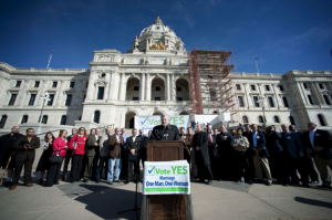 Minnesotans United for All Families took direct aim at the Catholic Church’s support of the amendment, with a kickoff television ad featuring a Catholic couple urging Minnesotans to reject the measure. At the same time, Twin Cities Catholic Archbishop John Nienstedt joined about 40 other faith leaders at the Capitol to encourage support for the marriage amendment.