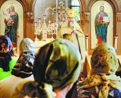 The Rev. Mark Shinn, bearded and gold-caped, appears through the “royal door” before the altar, an ornate chalice in each hand. Murmuring a prayer, he raises the goblets toward the worshipers, who bow and make the sign of the cross under the wide-eyed gaze of saintly icons. In a gesture of humility, some sweep their fingertips across the oak floor. A few prostrate themselves to kiss it.